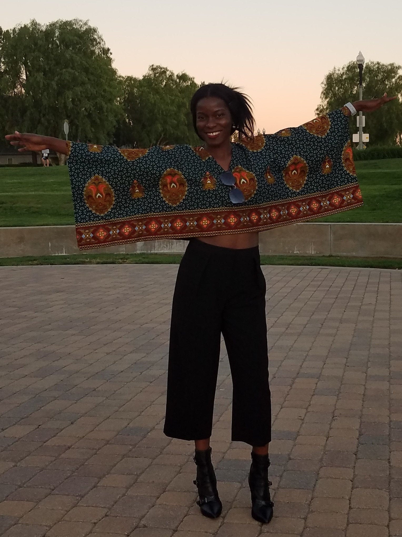 Casual summer V neck crop top in green java dashiki African print with flutter wide sleeves. Bubu, tunic style that may be worn with shorts or skinny jeans or trousers.